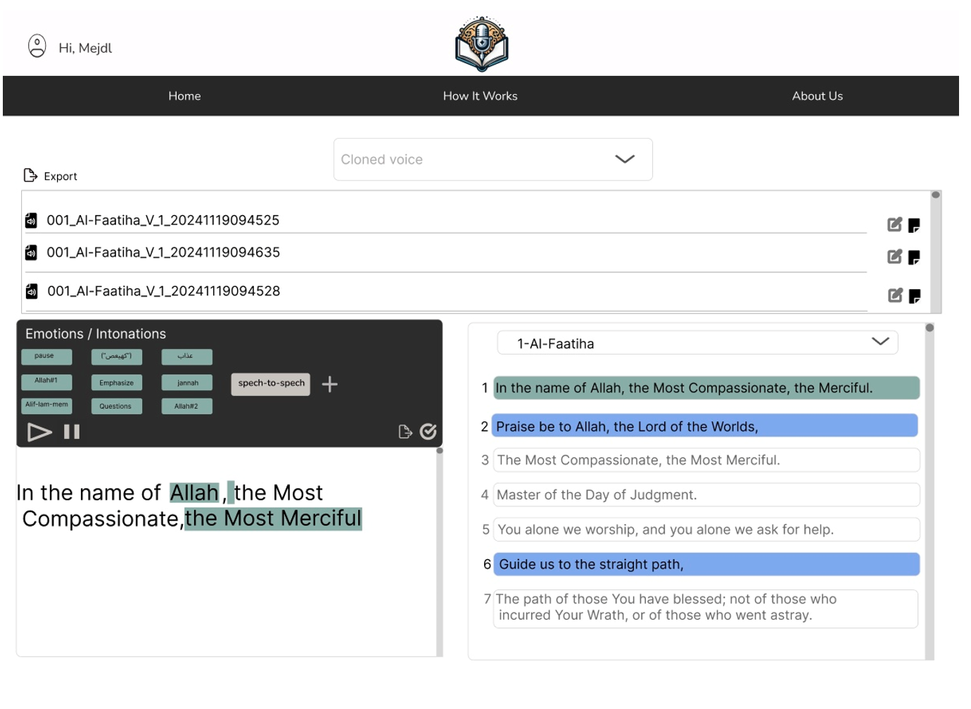 The system uses modle for speech synthesis technologies to generate natural-sounding voice for Quranic recitations. It also incorporates text annotation for taging words of translation Quran.